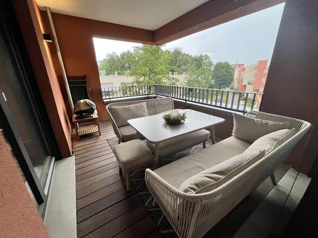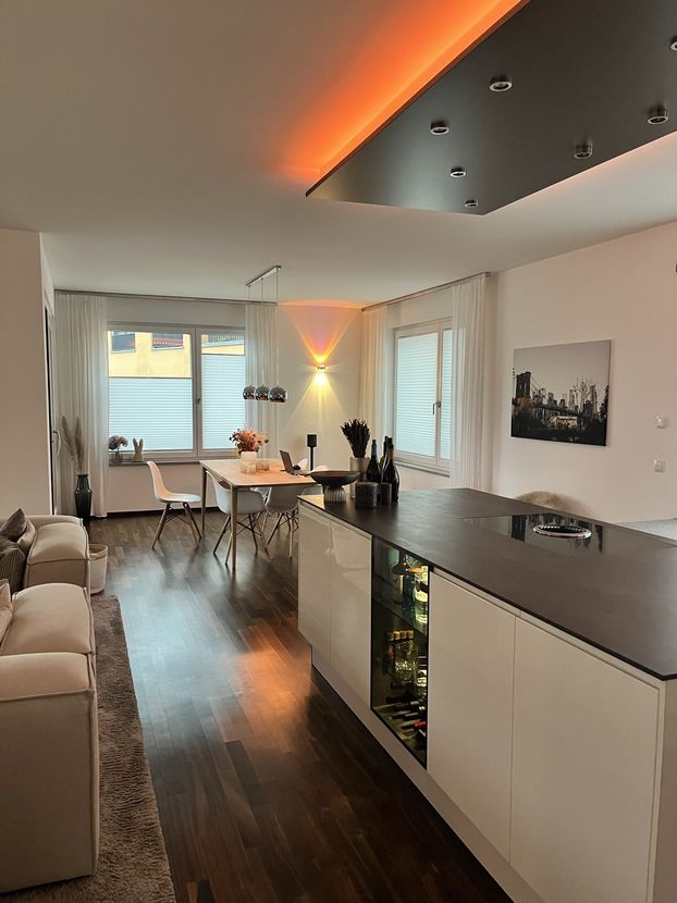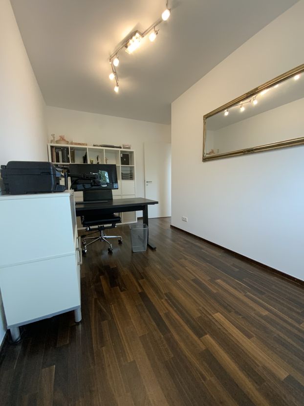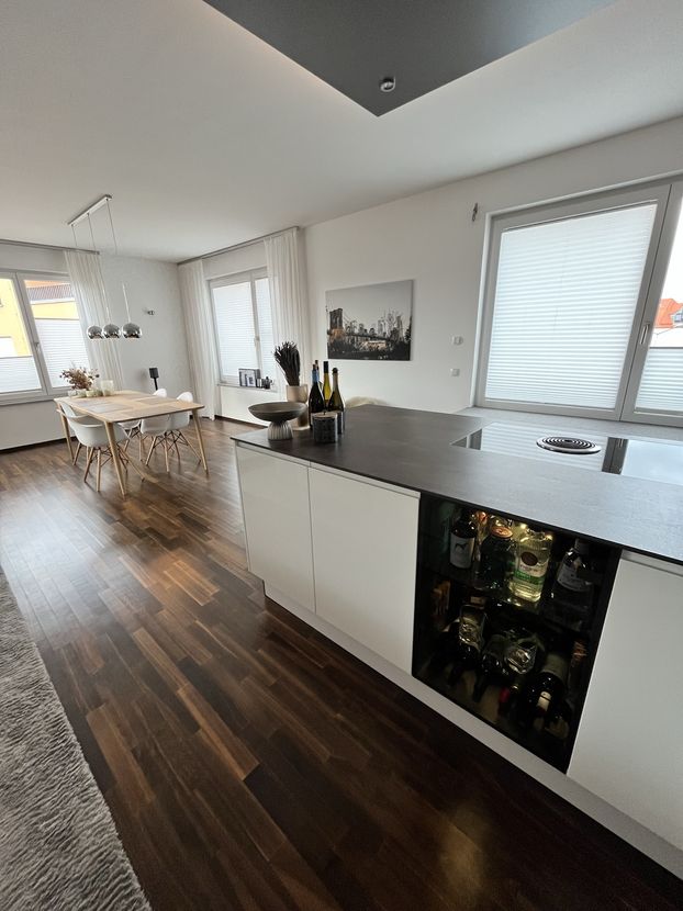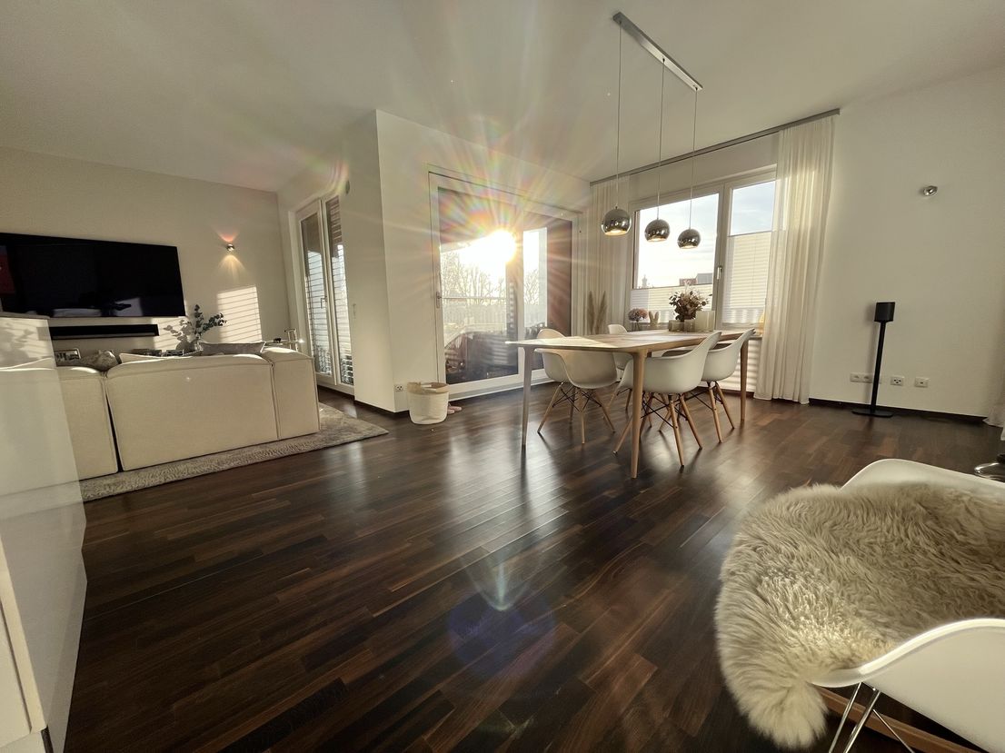The "Am Provinopark" residential complex was newly developed in 2013 in Augsburg's traditional textile district. It is centrally located with good infrastructure and boasts beautiful green spaces. The meticulously landscaped park surrounding the apartments features mature trees. The idyllic Schäfflerbach stream completes the attractive landscape architecture. Very close to the city center and surrounded by nature. The apartment itself is located in the second row along the Schäfflerbach stream. The open architecture on all sides offers views of both the romantic stream and the green courtyard. Living in the park and living by the water!